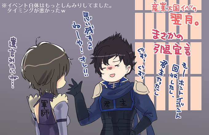 結構いい君主だったし、イベント自体もすごくしんみりしていたのですが、『プレイヤー思考』みたいなタイミングでどうしても、ネタにしかw踏ん切りよすぎだろwwww