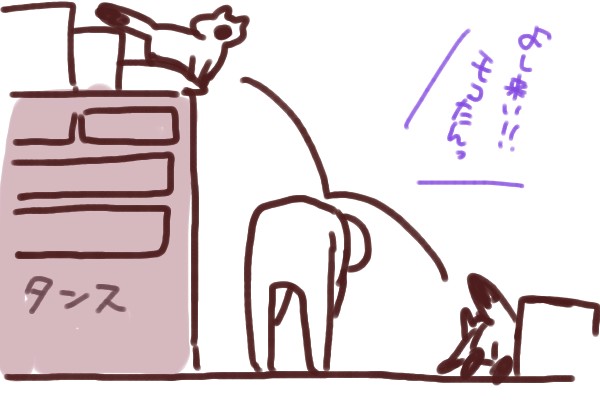 ネコと和解せよ! 昨日はモコ氏と意思疎通ができましたw何があったかと言えば、タンスの上に何故かカーペットが置いてあったのでそこにモコを載せる→モコさん高いとこ好き→でも台所でおかんが何かやってる→モコさん気になる。という、連鎖反応で試しに私がタンスの近くで馬跳びの馬のように構えて「ほら!来い!!」と言っていたら、本当にモコさんに私を足場にして降りて行きましたw何を言っているのかわからない人向けに下図参照w こんな感じ。本当に意思疎通できるとは…!というか、モコにとって私は足場なのか…?PR