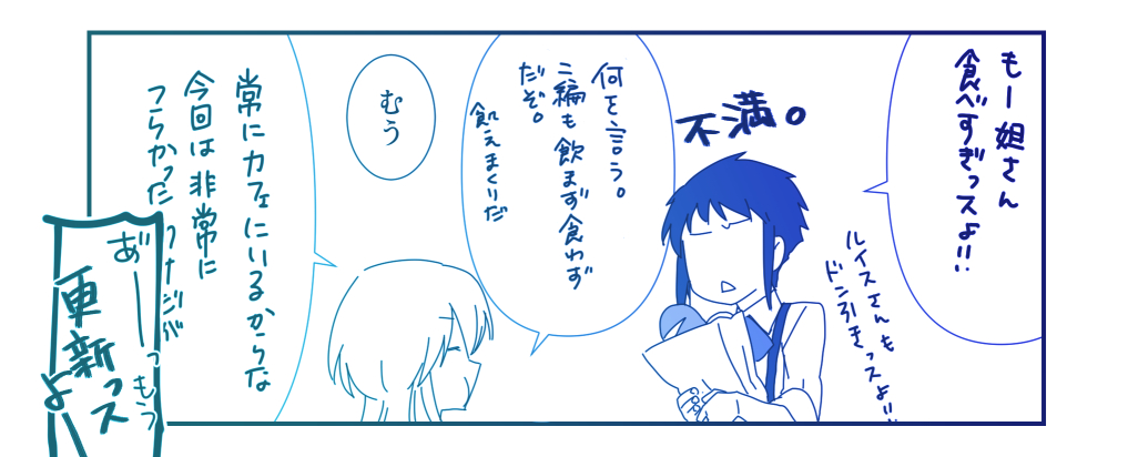 更新しました。 12月更新は回避しました。まだ、おまけが残ってますが…。ということで、雑談回。艦長はよく食べるキャラですが、ジャンクな食べ物はそんなに食べないです。日本にいれば、3色ネバネバ丼とか山掛けそばとか。とろろ好きか。漫画ひっくり返しで驚きなのが、たいていどっかのカフェにいたことw各漫画の中には必ず、食べに行ってます。そんなんで割と食べてなかったのでこんな話です。どうでも良いけれど、同じキャラで3部構成は、キャラに飽きる!PR