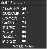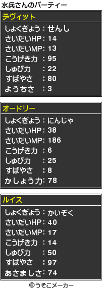 当に奇跡!! 凄絶に内輪(創作キャラ)ネタですっ…;先ほど、なんだか暇だったのでちょっとばかしうそ○メーカーさんのとこで遊んでましたwパーティーメーカーで名前入力する横の『勇者』を見て思わず[水兵さん]と入れたら奇跡が!!勇者水兵!すごすぎるぞwww!!まさか過ぎる三人目!!(…そ、そりゃあ、ありふれた名前を付けはしたが;)そして、あながち間違ってない職業wwwこのパーティーで一番強いんじゃない?とりあえず、爆笑しましたwwwhttp://usokomaker.com/party/PR